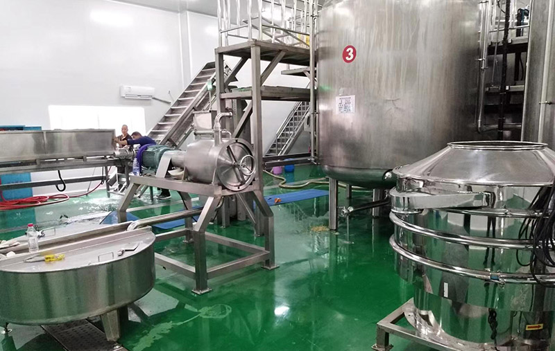 (3)破碎:这道工序是关系到番茄汁粘稠度的重要。工序,有热破碎和冷破碎两种方法。一般生产都应用热破碎,一方面出汁率高,另一方面酶钝化快,番茄汁的粘度较高,果汁不易分层 ,但热破碎温度和时间的不同,对番茄汁的粘度还有很大的影响,而粘度又是影响果汁稳定性及风味的重要因素。