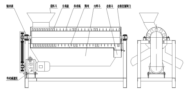 该机由传动减速机、轴承座、机架、进料斗、传动辊、分离板、出料斗、出核斗等部件组成。工作原理:物料由进料斗进入去核工作室,由于去核室内辊子上置有不同角度的分离板,使水果的果肉与果核分离。被分离的果肉从筛网孔中落入出料斗中,果核则由数个分离板组成的螺旋,向出核处移动由出核斗排出,筛网和分离板之间的间隙可试处理物料核的大小而定。